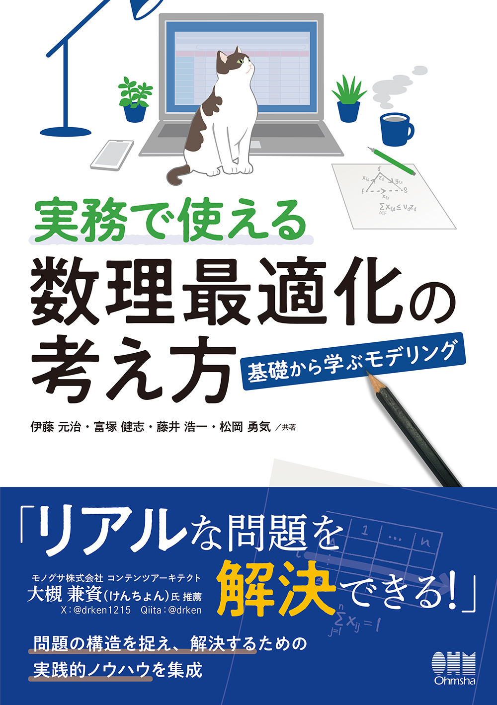 モデリングには、「教科書的な問題」と「現実の問題」の間に大きな壁があります。本書は、数理最適化の実応用に日々取り組んでいる著者たちが、その経験をもとに、「数理最適化を使う際にどのようなことを気にするか」「どのように問題を捉えるか」などを、「数理最適化の考え方」としてまとめたものです。