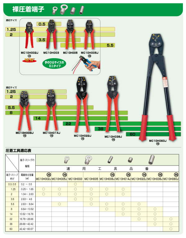 【手のひらサイズのミニタイプから60㎟が手動で圧着できる強力圧着工具まで, 幅広いラインナップ】 ・裸圧着端子・スリーブ用 ●安全・確実の品質で圧着作業を!! ●ミノル工業(株)のフラグシップ製品「圧着工具」 ●手のひらサイズのミニタイプ:MC10H002JとMC10H003, MC10H005, MC10H005J ●強力圧着工具:MC10H060J 等多数 製品情報 : 圧着工具