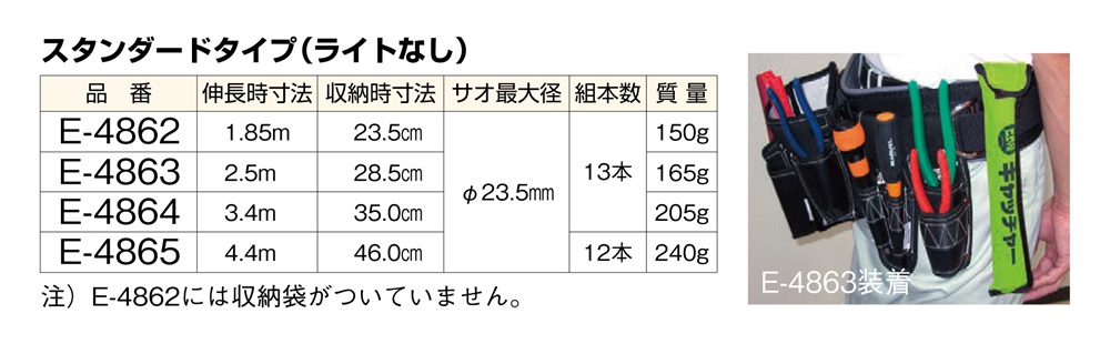 【軽量コンパクトサイズ 配線工事の腰巾着!】 ●伸長時寸法:1.85m, 2.5m, 3.4m, 4.4mの4種類 ●収納袋付き(※E-4862にはついておりません. ) ●E-4012J スルーラインジョイント(別売り)に接続可能 ●先端の1本は蛍光色仕上げ ●厚ゴム仕上げ(底割れ防止) 製品情報:miniカーボンキャッチャー
