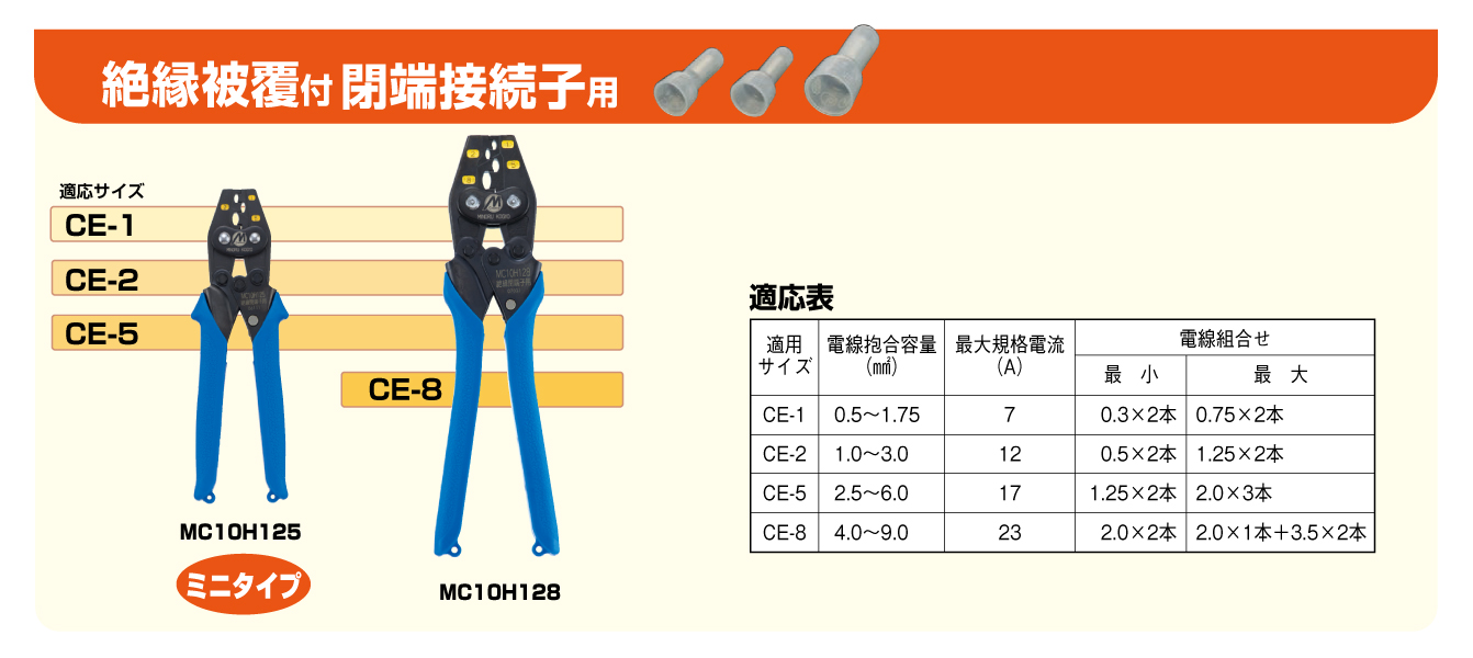 【ミニタイプと2種類ラインナップ】 ・絶縁被覆付閉端接続子用 ●ミニタイプのMC10H125(CE-1・CE-2・CE-5) ●全長:182mm 質量:250g ●1丁で4サイズのMC10H128(CE-1・CE-2・CE-5・CE-8) ●全長:244mm 質量:400g 製品情報 : MC10H125 製品情報 : MC10H128