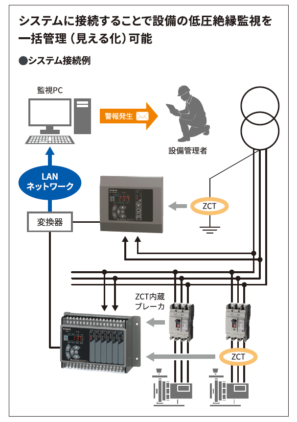 漏電リレー、漏電遮断器の動作レベルに達しない微小な漏洩電流を検出することが可能。漏洩電流を常時監視することにより絶縁劣化の兆候を把握、予防保全により事故を末然に防ぎ設備の安定稼働を実現する。また、絶縁抵抗測定試験の代用とし、通常年1回の実施が必要な絶縁抵抗測定試験の実施周期を延長した実績があり、保守業務の省力化に貢献する技術となっている。検出方式は真に危険な「抵抗分」の漏洩電流のみを検出するIor 方式(基本波有効分方式)を採用し、安定的な動作を実現している。