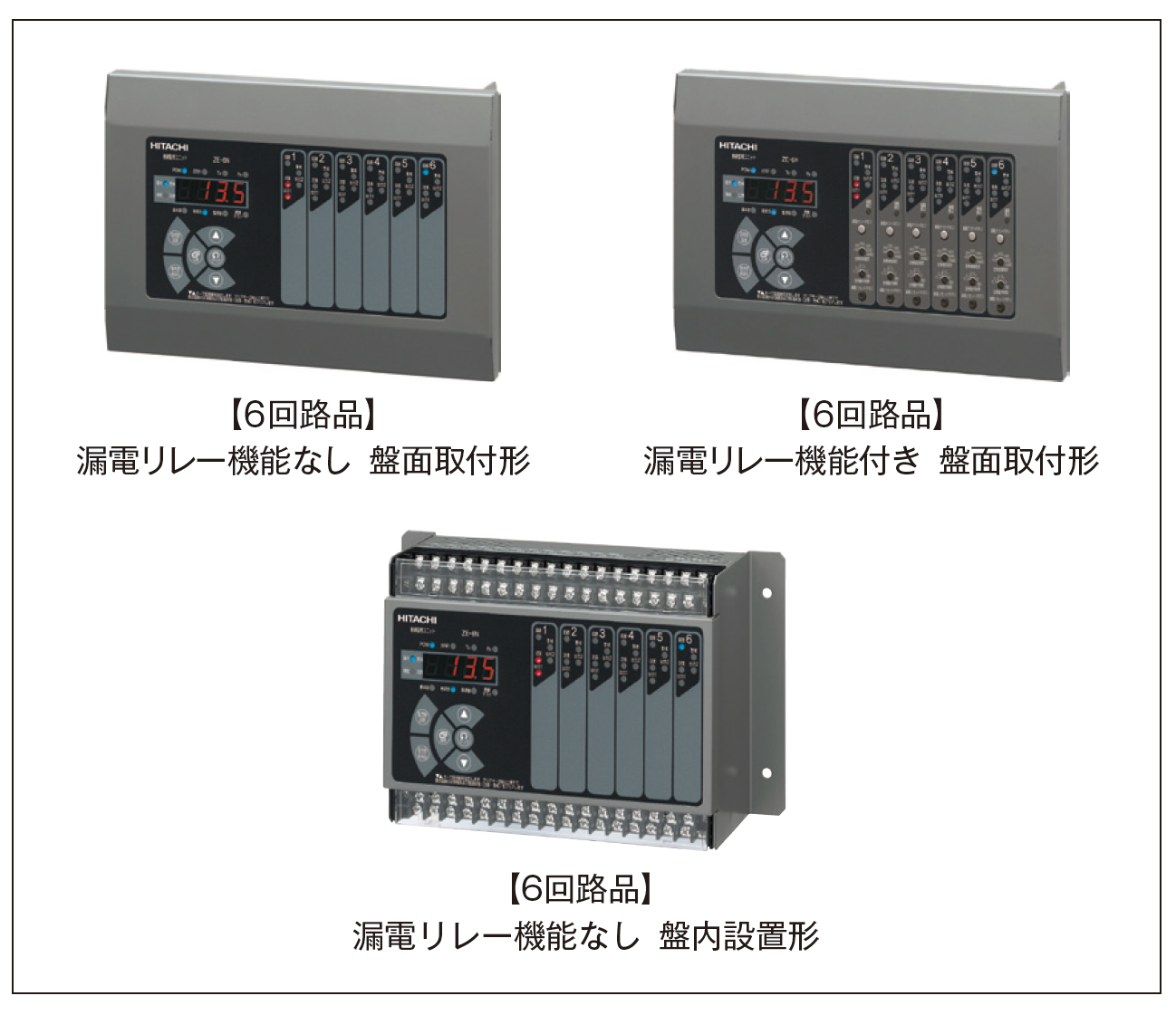 本製品は監視ポイントに合わせ選定しやすいようさまざまな回路数(1/2/6/10 回路)のラインアップがあり、さらに保護継電器として使用可能な漏電リレー機能付きも準備。ZCT とMCCB が1つになったZCT 内蔵ヒューズフリー遮断器と組み合わせることで、配電盤内の省スペース設計も可能となっている。