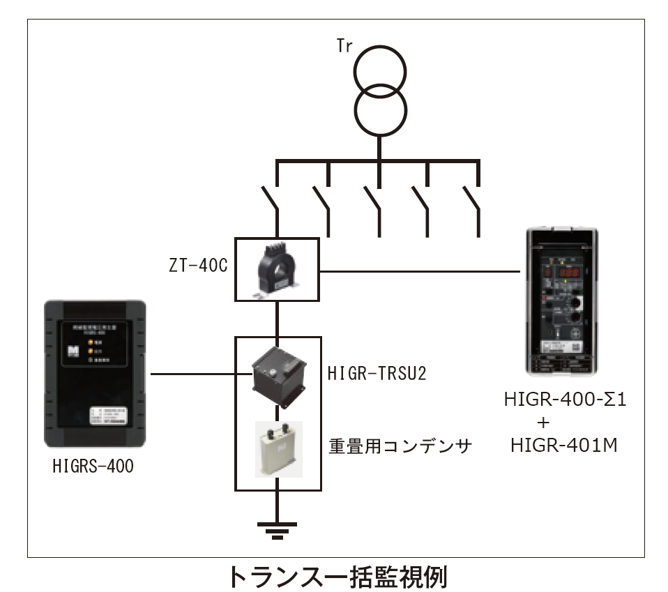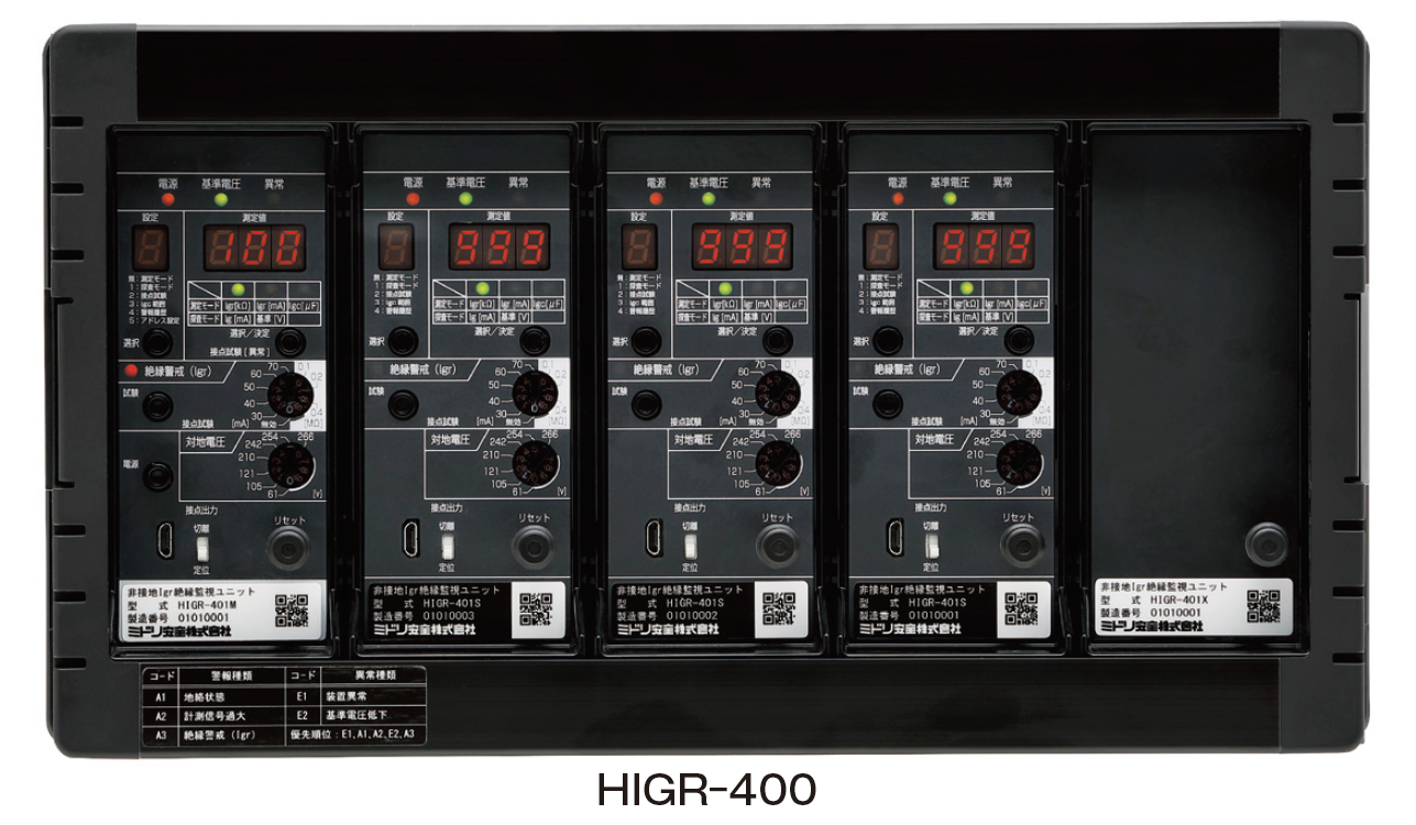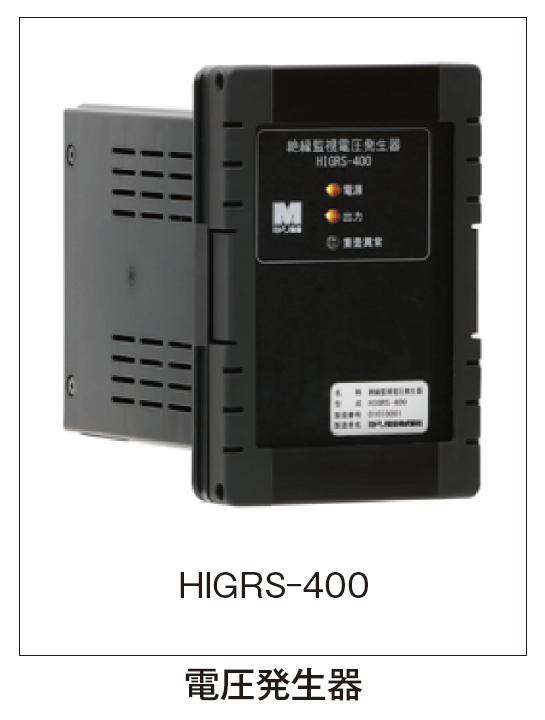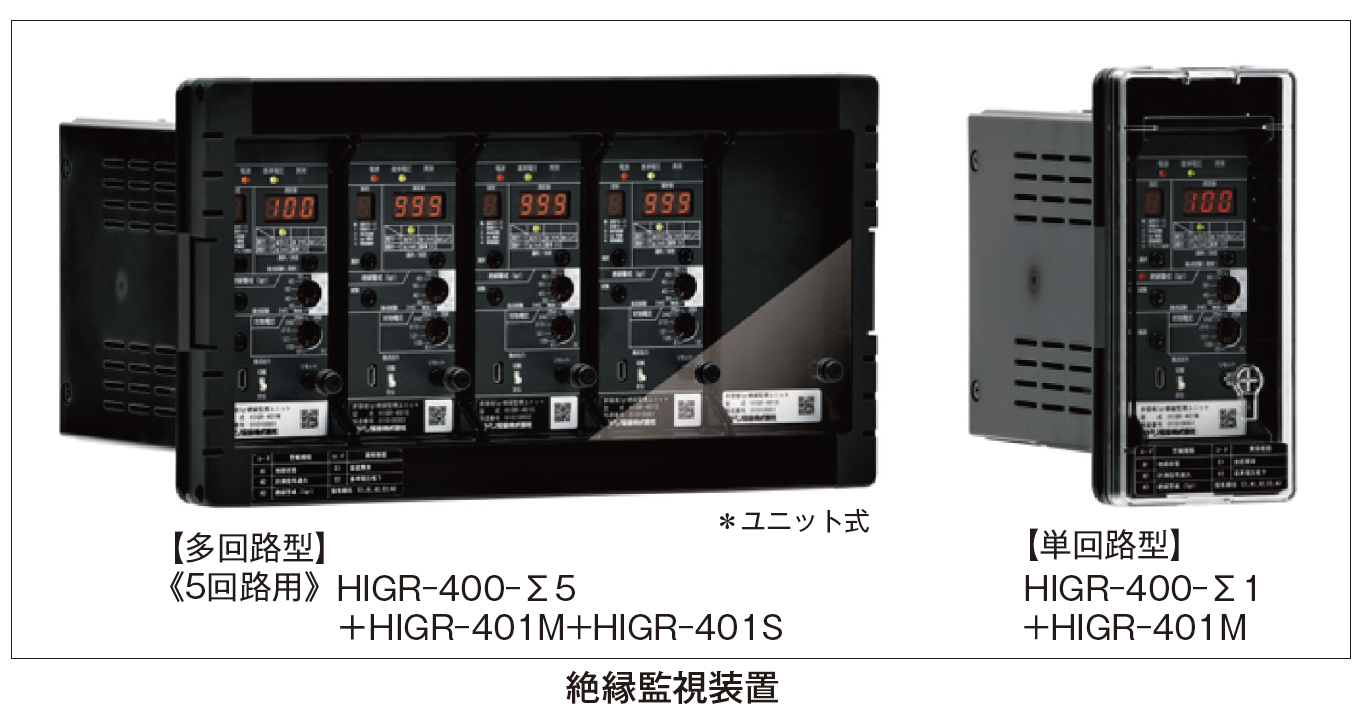 非接地回路用低圧絶縁監視装置 HIGR-400はUPS設備などの非接地電路の絶縁状態を常時監視する装置である。非接地電路は絶縁不良が発生しても漏れ電流が発生しないため、活線状態で絶縁状態を把握することは困難であるが、測定方式に実績のあるIgr方式を採用し、1H、5V の信号を電路に重畳することにより対地静電容量の影響を受けずに絶縁状態を高精度に計測する。また、直流電圧を使用する方式の監視装置の場合には警報が発生しても活線のまま探査することができないが、Igr方式は専用の探査器により絶縁不良個所の探査が無停電で可能である。 従来品に比べ測定性能を向上し、電気設備技術基準に則した0.1MΩ、0.2MΩ、0.4MΩ の測定が可能となる1MΩ までの測定を実現した。 データセンターや放送設備、無監視になりがちなダウントランス2次側の非接地電路の監視にも有効である。
