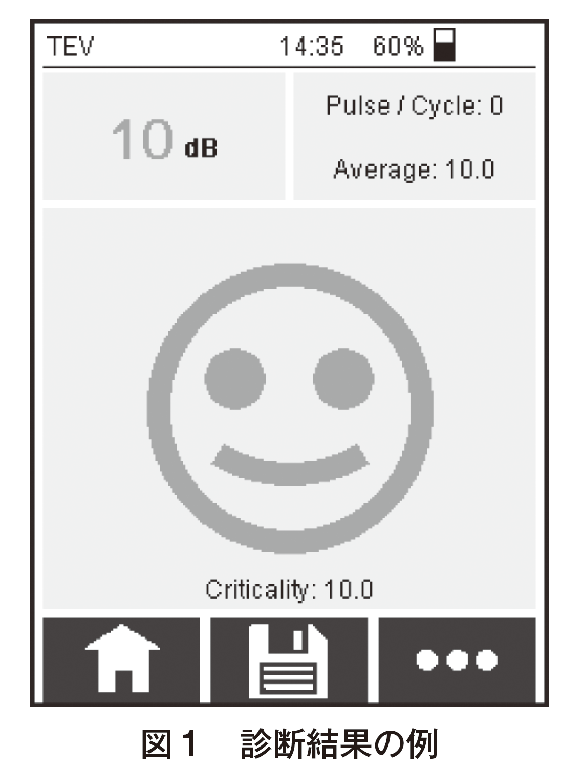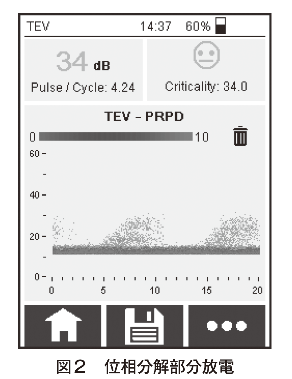 <解説> 高圧および特別高圧の受変電設備機器の突発的なトラブルは、修理費用が高額になるだけでなく、事業所全体の運営に大きな影響を及ぼす可能性がある。そのため、電力設備機器の絶縁劣化の兆候を可能な限り早期に検出し、適切な対策を講じることが重要である。PD SCANは、電力設備機器を停電させることなく、活線状態で絶縁劣化の兆候をすばやく捉えるための診断器である。 <特長とセンサーの用途> PD SCAN は、TEV(過渡接地電圧)センサーや超音波センサーを内蔵した、小型で軽量な携帯型部分放電検出器である。内蔵されたTEV センサーにより、閉塞配電盤の扉を開けることなく、絶縁劣化の初期兆候である「部分放電」をすばやく検出できる。また、2つのTEV センサーを使用することで配電盤2面の比較測定が可能となる。さらに、オプションのHFCT(高周波変流器)センサーを使用したケーブルの絶縁診断や、パラボラレシーバー(超音波センサー)を使用した遠隔からの部分放電検出も可能となる。 <操作> 操作はボタンとタッチパネルで簡単に行える。さらに、オプションのセンサーは本体に接続するだけで自動認識されるため、複雑な設定は不要である。 <診断結果> 診断結果は、部分放電のレベルの大きさとパルスの数を基に自動的に診断し、3種類のアイコン(正常、注意、危険)で表示する(図1:診断結果の例)。また、部分放電の種類(コロナ、沿面、内部)の特定とノイズの分別も可能である(図2:位相分解部分放電)。 <管理と試験報告書> PD SCANはカメラとQR コードスキャナーを内蔵しており、付属のレポート作成ソフトウェア「MeggerBookRE」を使用することで詳細な報告書を作成できる。さらに、QR コードを活用した設備管理により、前回の測定結果との比較が容易に行える(図3:写真撮影、図4:QR コードスキャナー)。