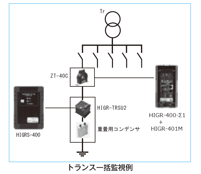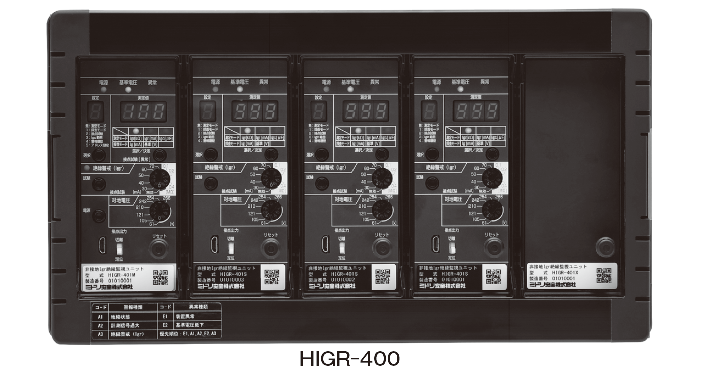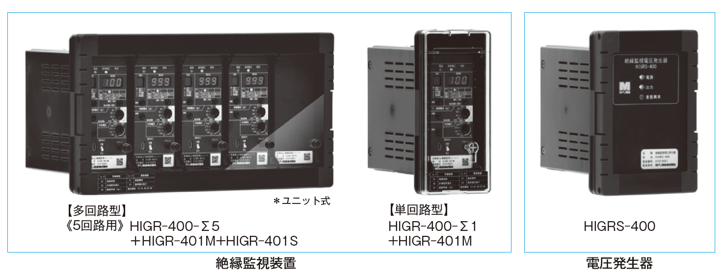 非接地回路用低圧絶縁監視装置 HIGR-400はUPS設備などの非接地電路の絶縁状態を常時監視する装置である。非接地電路は絶縁不良が発生しても漏れ電流が発生しないため、活線状態で絶縁状態を把握することは困難であるが、測定方式に実績のあるIgr方式を採用し、1H、5V の信号を電路に重畳することにより対地静電容量の影響を受けずに絶縁状態を高精度に計測する。また、直流電圧を使用する方式の監視装置の場合には警報が発生しても活線のまま探査することができないが、Igr方式は専用の探査器により絶縁不良個所の探査が無停電で可能である。 従来品に比べ測定性能を向上し、電気設備技術基準に則した0.1MΩ、0.2MΩ、0.4MΩ の測定が可能となる1MΩ までの測定を実現した。 データセンターや放送設備、無監視になりがちなダウントランス2次側の非接地電路の監視にも有効である。